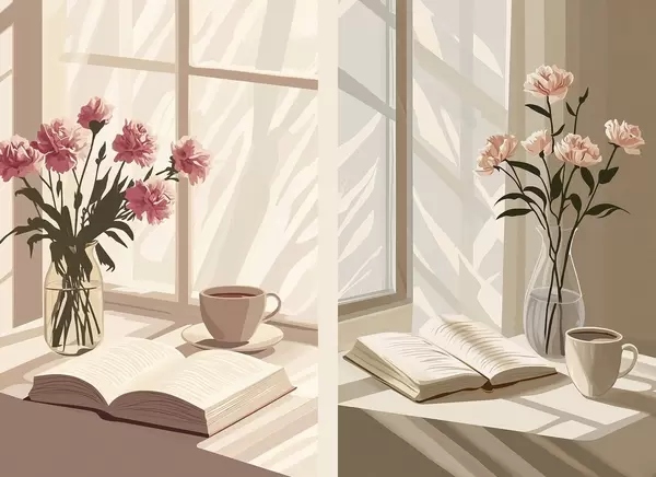 Poster Absztrakció, reggeli esztétika, csésze kávé, könyv, virágok Nr d00448