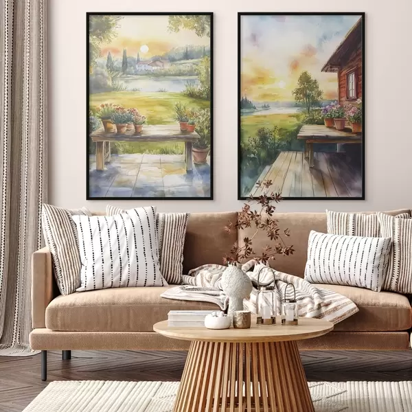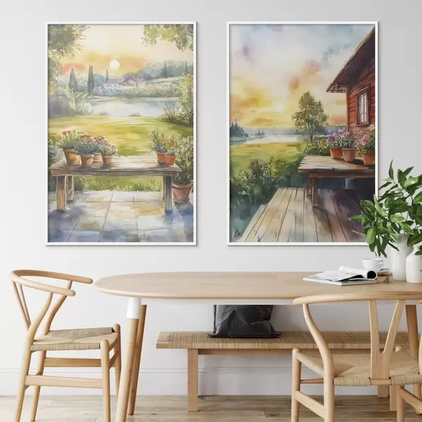 Poster Nyári falu, naplemente, rusztikus, virágok, tó, akvarell stílusban Nr d00449