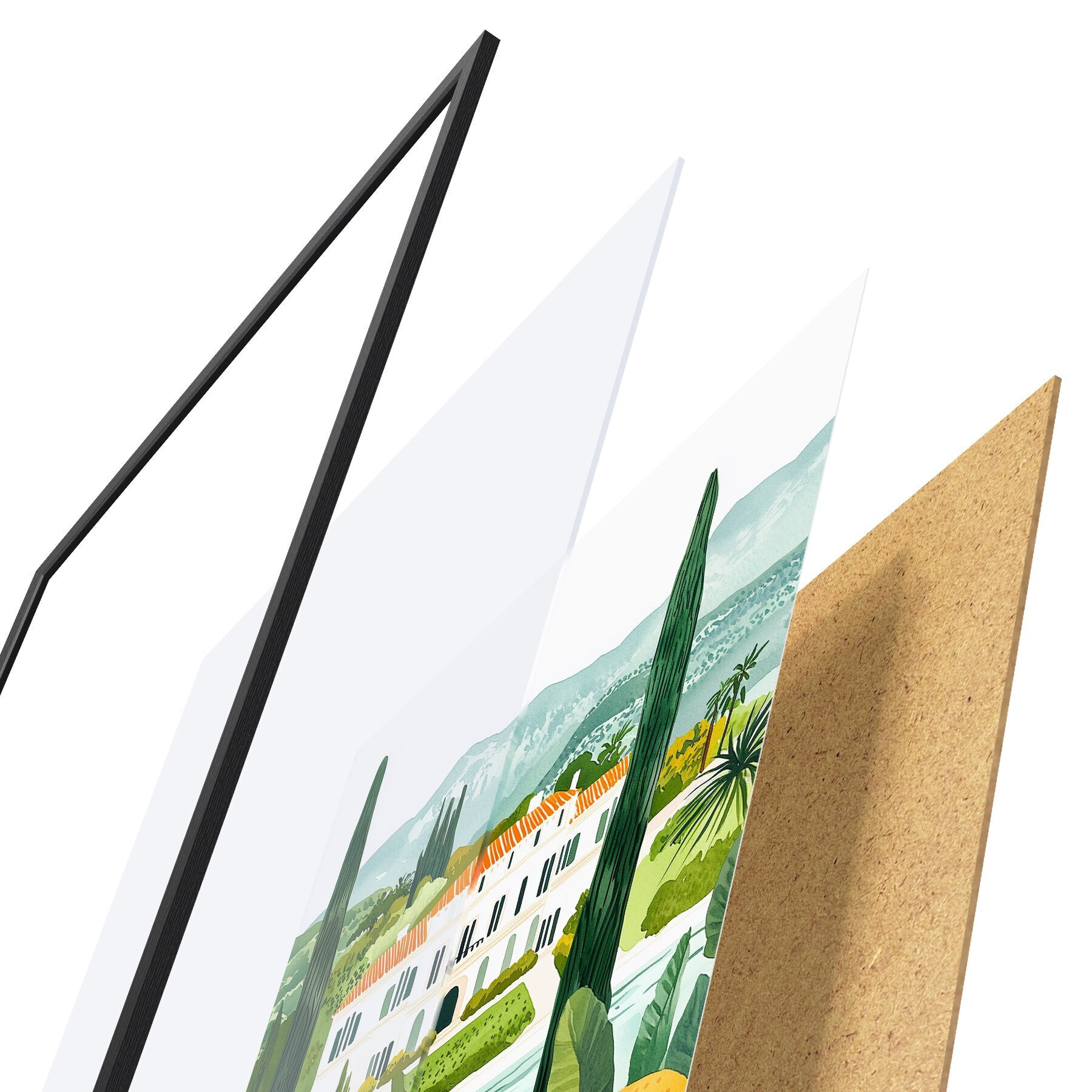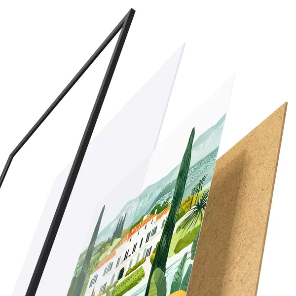 A poszter keretből, plexiből, nyomtatott képből és forgácslap hátlapból áll. A poszter a hátoldalon található rögzítőknek köszönhetően azonnal felakasztható a falra.