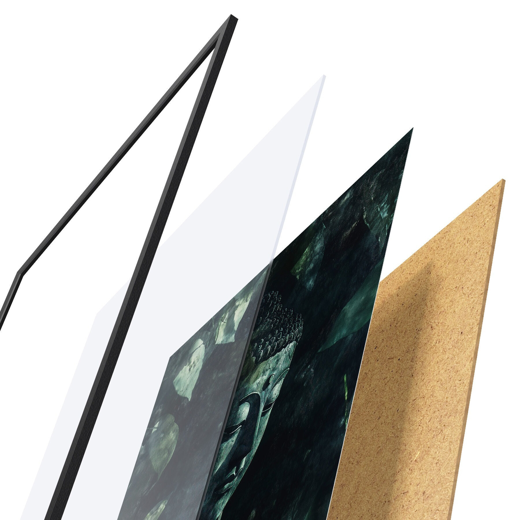 A poszter keretből, plexiből, nyomtatott képből és forgácslap hátlapból áll. A poszter a hátoldalon található rögzítőknek köszönhetően azonnal felakasztható a falra.