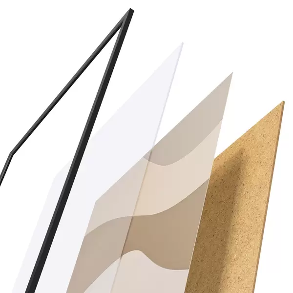 A poszter keretből, plexiből, nyomtatott képből és forgácslap hátlapból áll. A poszter a hátoldalon található rögzítőknek köszönhetően azonnal felakasztható a falra.