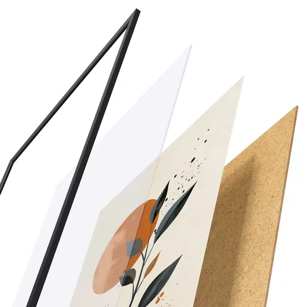 A poszter keretből, plexiből, nyomtatott képből és forgácslap hátlapból áll. A poszter a hátoldalon található rögzítőknek köszönhetően azonnal felakasztható a falra.