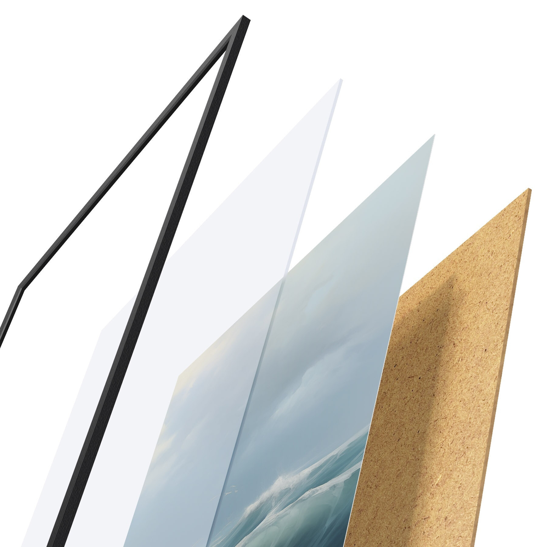 A poszter keretből, plexiből, nyomtatott képből és forgácslap hátlapból áll. A poszter a hátoldalon található rögzítőknek köszönhetően azonnal felakasztható a falra.