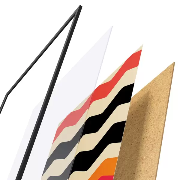 A poszter keretből, plexiből, nyomtatott képből és forgácslap hátlapból áll. A poszter a hátoldalon található rögzítőknek köszönhetően azonnal felakasztható a falra.
