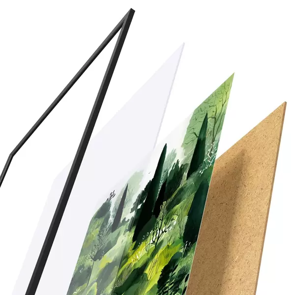 A poszter keretből, plexiből, nyomtatott képből és forgácslap hátlapból áll. A poszter a hátoldalon található rögzítőknek köszönhetően azonnal felakasztható a falra.