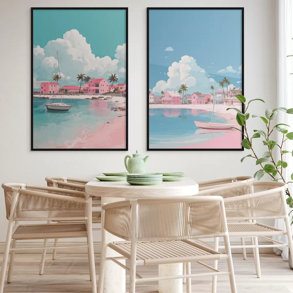 Poster Rózsaszín nyári strand napsütéssel, vitorlással és házakkal Nr d00479