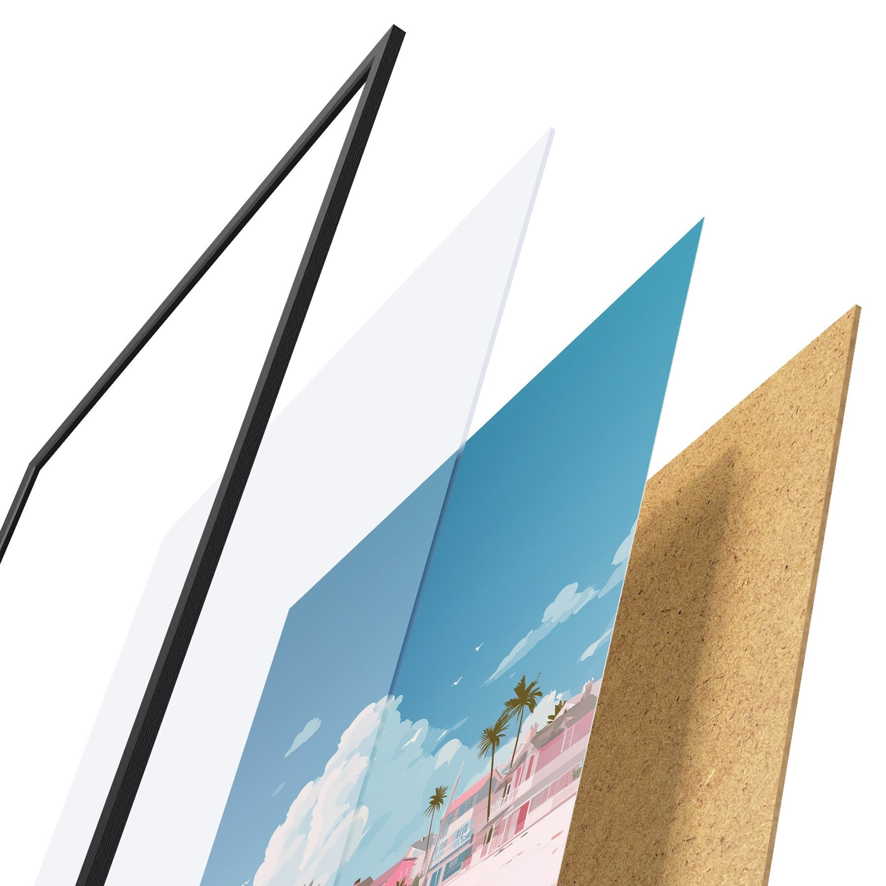 A poszter keretből, plexiből, nyomtatott képből és forgácslap hátlapból áll. A poszter a hátoldalon található rögzítőknek köszönhetően azonnal felakasztható a falra.