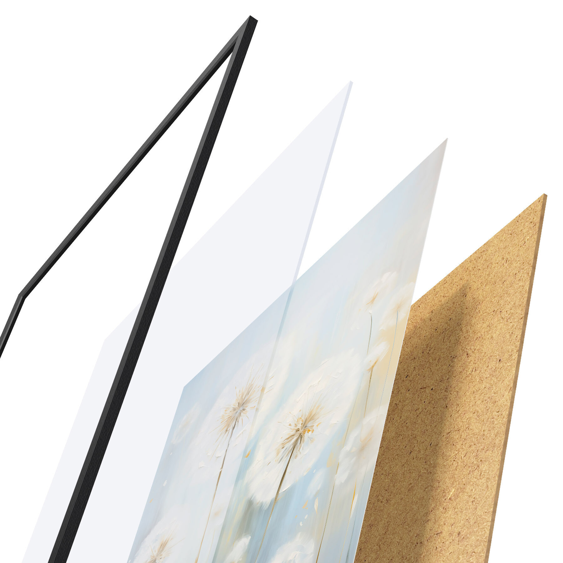 A poszter keretből, plexiből, nyomtatott képből és forgácslap hátlapból áll. A poszter a hátoldalon található rögzítőknek köszönhetően azonnal felakasztható a falra.