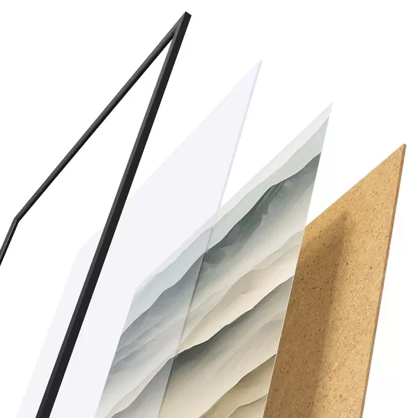 A poszter keretből, plexiből, nyomtatott képből és forgácslap hátlapból áll. A poszter a hátoldalon található rögzítőknek köszönhetően azonnal felakasztható a falra.
