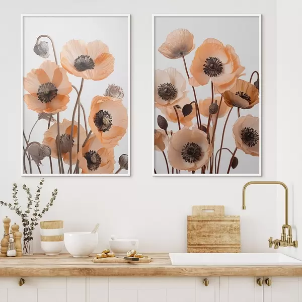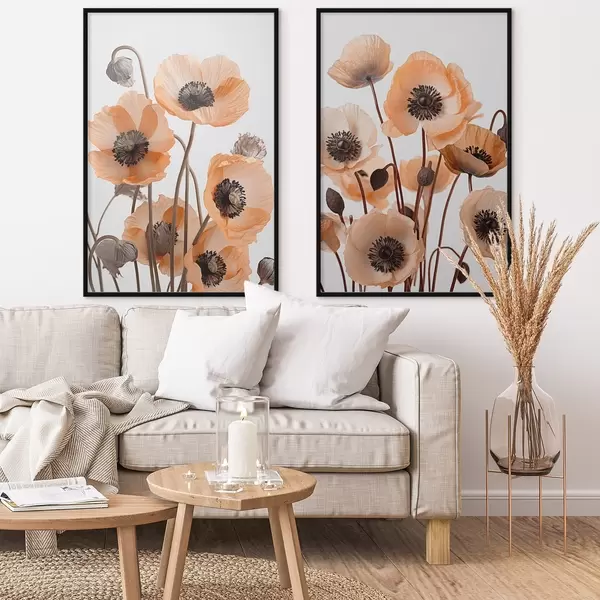 Poster Narancssárga pipacsok, szárított virágok világos háttér előtt, lágy megvilágítás, finom szirmok, virágkötészet Nr d00518