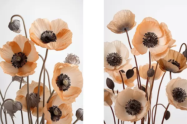 Poster Narancssárga pipacsok, szárított virágok világos háttér előtt, lágy megvilágítás, finom szirmok, virágkötészet Nr d00518