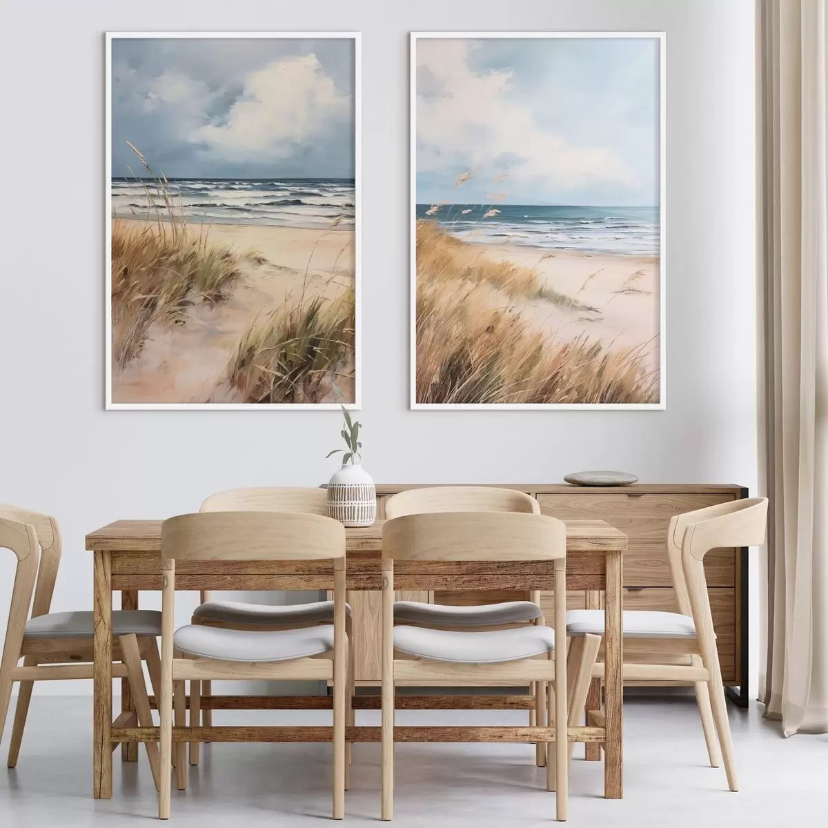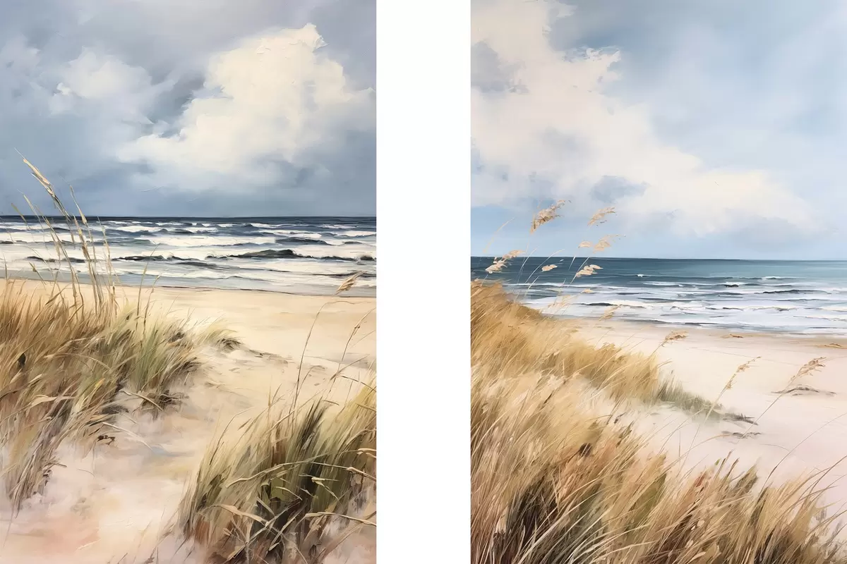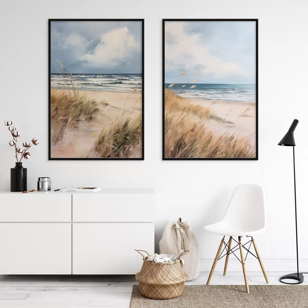 Poster Homokos tengerpart magas fűvel az előtérben, az óceán hullámokkal és felhős égbolt a háttérben Nr d00521