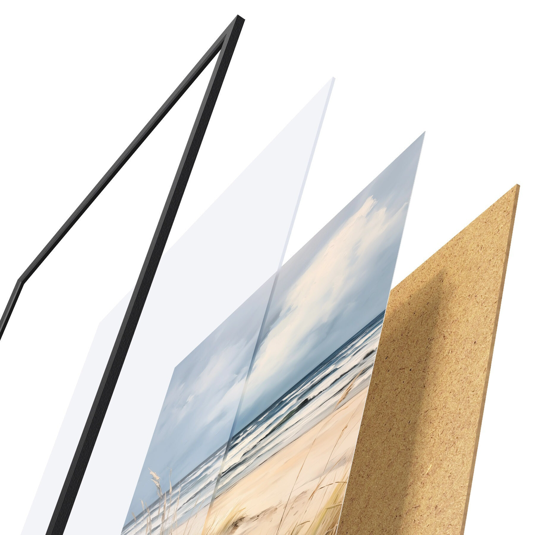 A poszter keretből, plexiből, nyomtatott képből és forgácslap hátlapból áll. A poszter a hátoldalon található rögzítőknek köszönhetően azonnal felakasztható a falra.