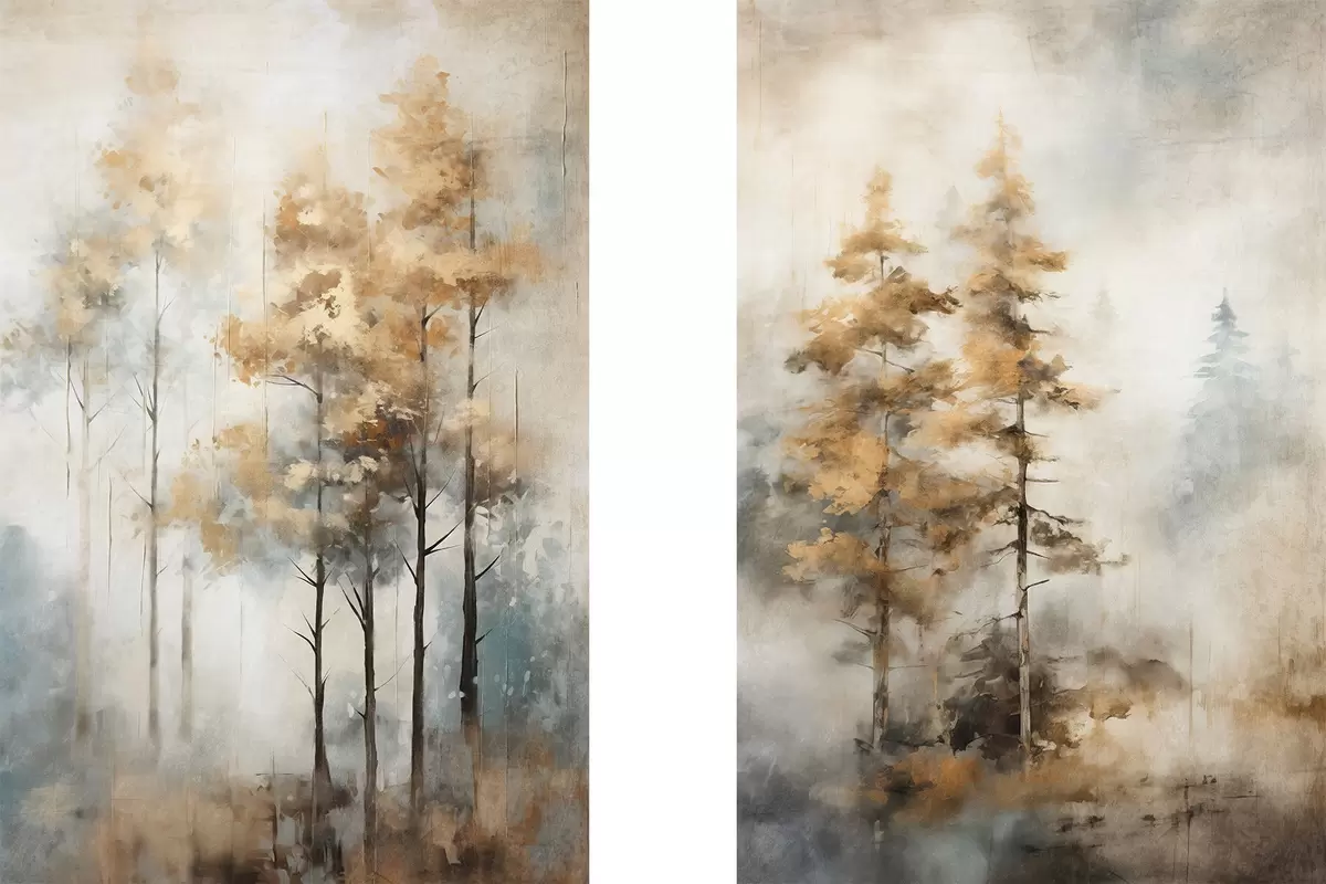 Poster Texturált magas fák sárga levelekkel egy erdőben , a háttér lágy kék és barna tónusok keveréke Nr d00528