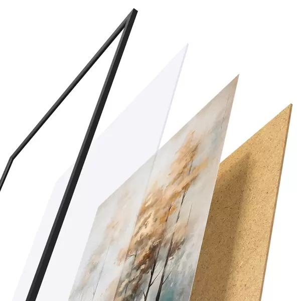 A poszter keretből, plexiből, nyomtatott képből és forgácslap hátlapból áll. A poszter a hátoldalon található rögzítőknek köszönhetően azonnal felakasztható a falra.