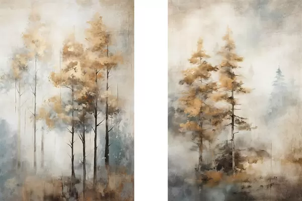 Poster Texturált magas fák sárga levelekkel egy erdőben , a háttér lágy kék és barna tónusok keveréke Nr d00528