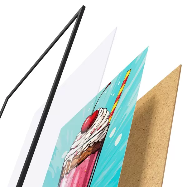 A poszter keretből, plexiből, nyomtatott képből és forgácslap hátlapból áll. A poszter a hátoldalon található rögzítőknek köszönhetően azonnal felakasztható a falra.