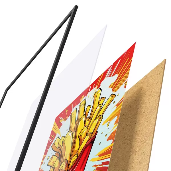 A poszter keretből, plexiből, nyomtatott képből és forgácslap hátlapból áll. A poszter a hátoldalon található rögzítőknek köszönhetően azonnal felakasztható a falra.