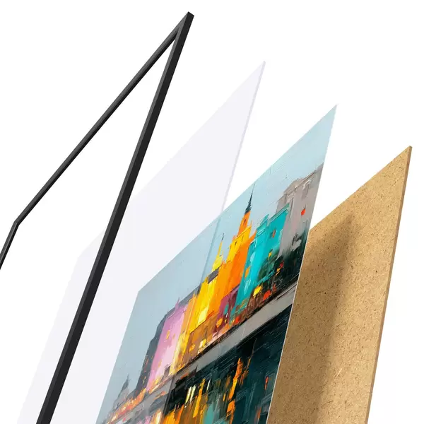 A poszter keretből, plexiből, nyomtatott képből és forgácslap hátlapból áll. A poszter a hátoldalon található rögzítőknek köszönhetően azonnal felakasztható a falra.