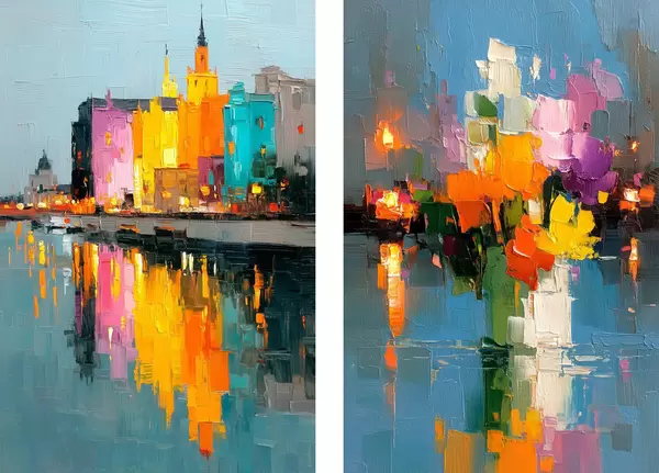 Plakát a sziklán Városi dinamika: absztrakt kompozíció a folyón tükröződő fényekkel d00569
