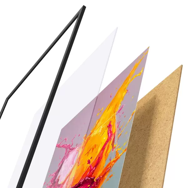 A poszter keretből, plexiből, nyomtatott képből és forgácslap hátlapból áll. A poszter a hátoldalon található rögzítőknek köszönhetően azonnal felakasztható a falra.