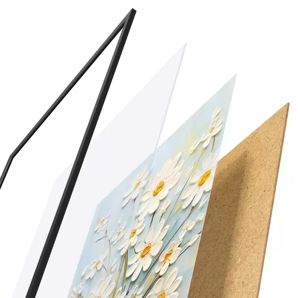 A poszter keretből, plexiből, nyomtatott képből és forgácslap hátlapból áll. A poszter a hátoldalon található rögzítőknek köszönhetően azonnal felakasztható a falra.