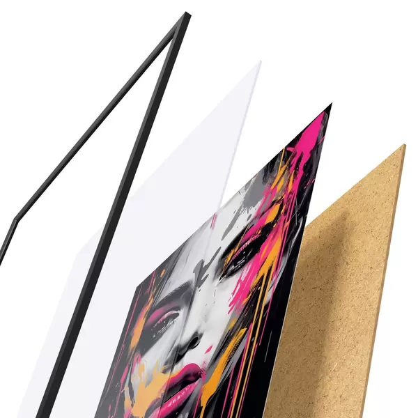 A poszter keretből, plexiből, nyomtatott képből és forgácslap hátlapból áll. A poszter a hátoldalon található rögzítőknek köszönhetően azonnal felakasztható a falra.