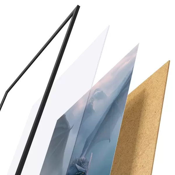 A poszter keretből, plexiből, nyomtatott képből és forgácslap hátlapból áll. A poszter a hátoldalon található rögzítőknek köszönhetően azonnal felakasztható a falra.