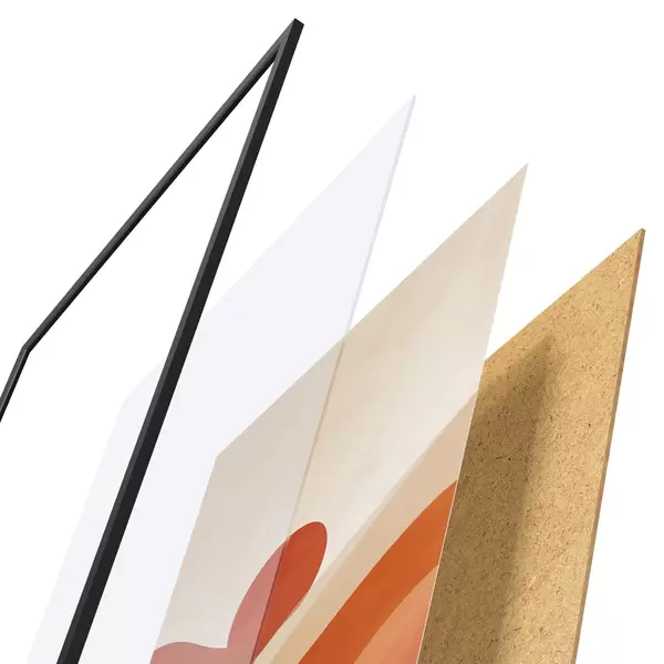 A poszter keretből, plexiből, nyomtatott képből és forgácslap hátlapból áll. A poszter a hátoldalon található rögzítőknek köszönhetően azonnal felakasztható a falra.
