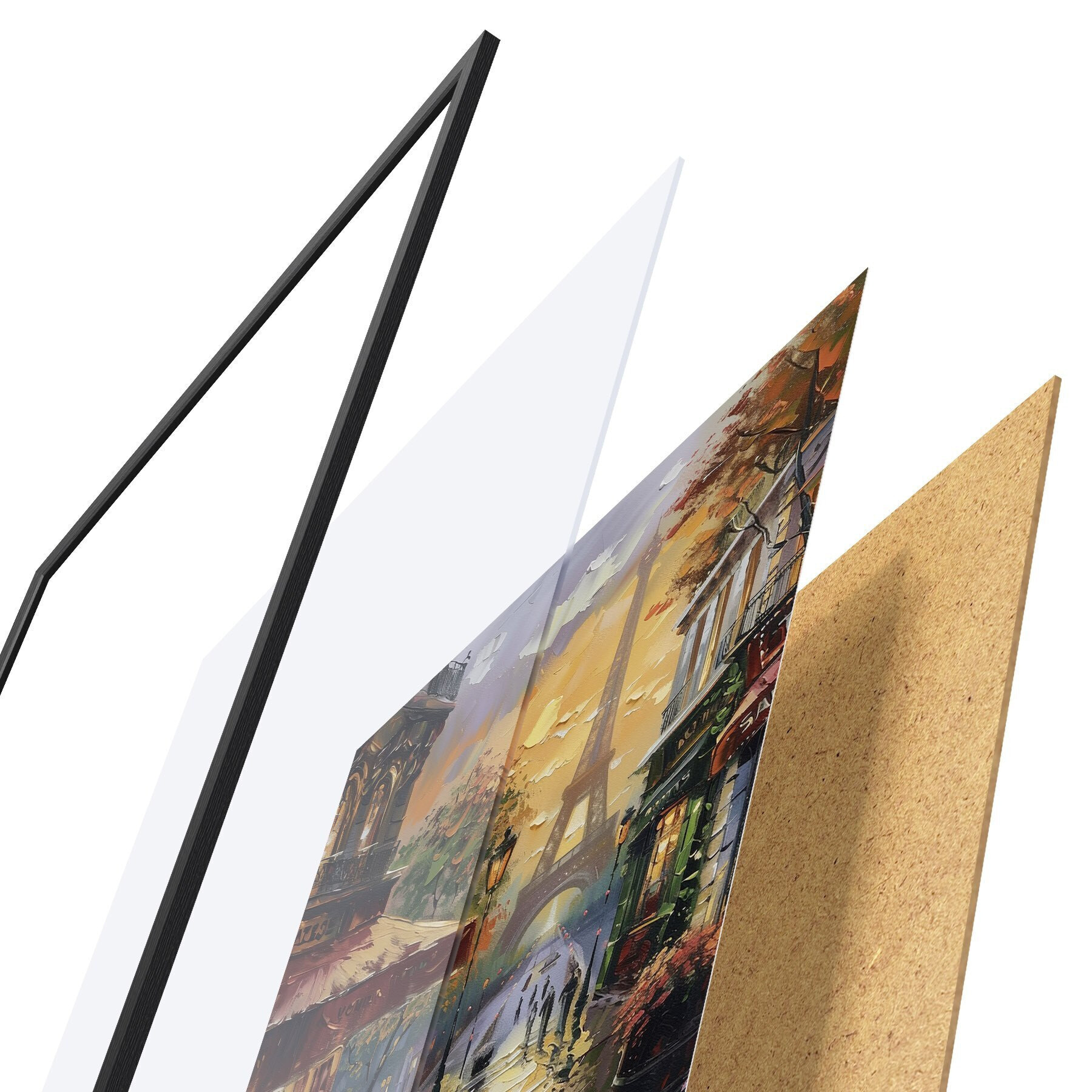 A poszter keretből, plexiből, nyomtatott képből és forgácslap hátlapból áll. A poszter a hátoldalon található rögzítőknek köszönhetően azonnal felakasztható a falra.