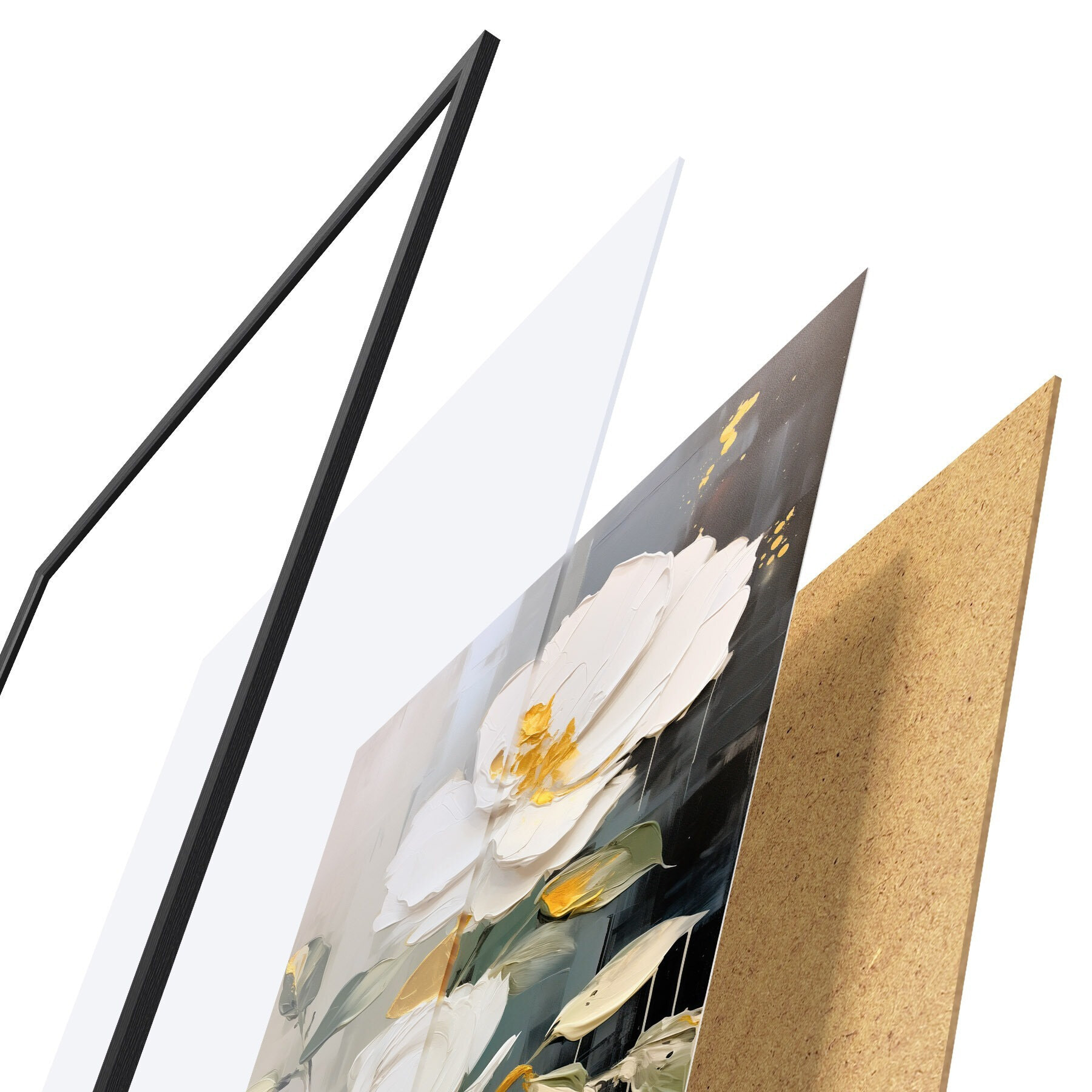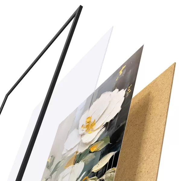 A poszter keretből, plexiből, nyomtatott képből és forgácslap hátlapból áll. A poszter a hátoldalon található rögzítőknek köszönhetően azonnal felakasztható a falra.