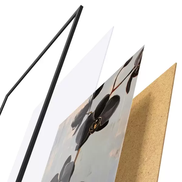 A poszter keretből, plexiből, nyomtatott képből és forgácslap hátlapból áll. A poszter a hátoldalon található rögzítőknek köszönhetően azonnal felakasztható a falra.