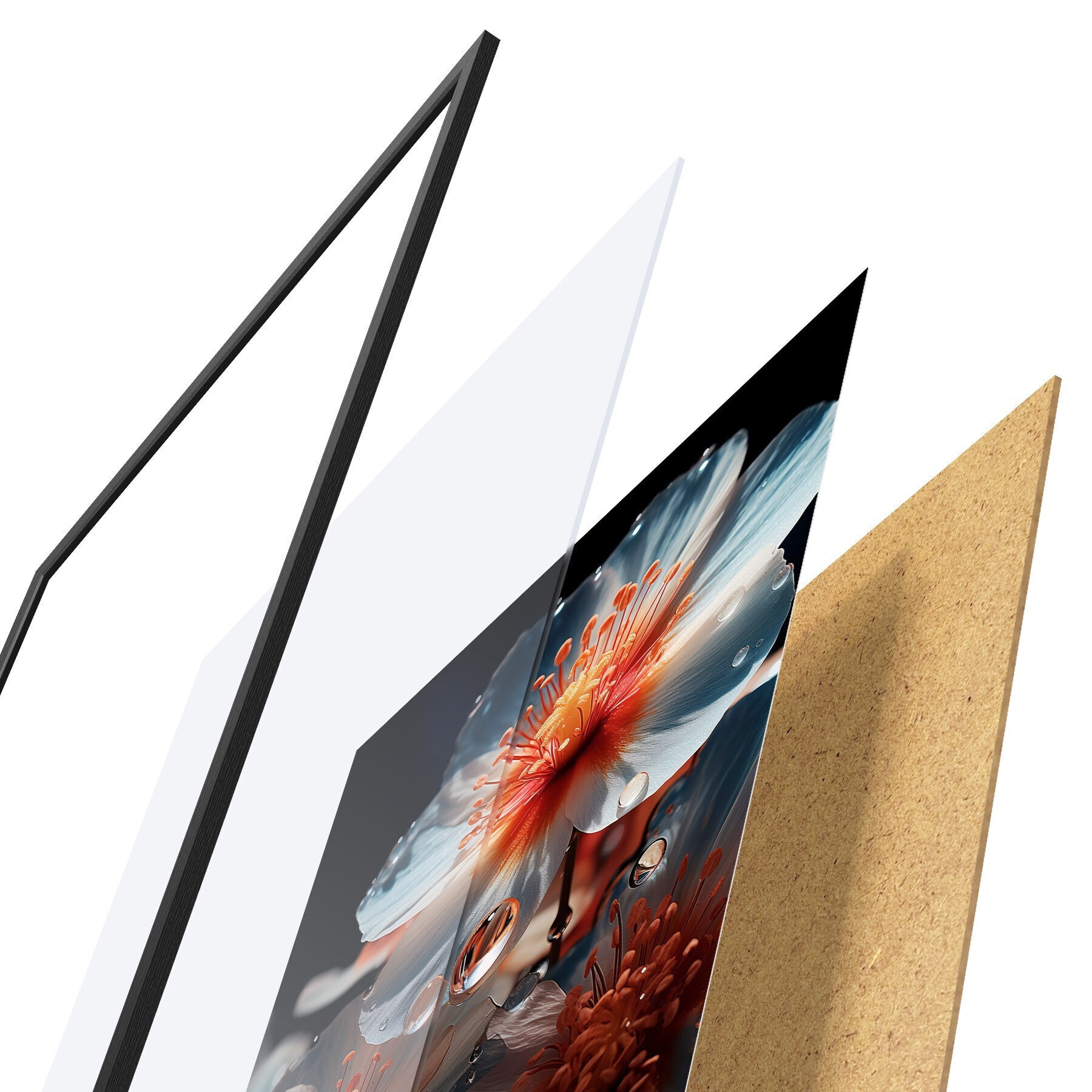 A poszter keretből, plexiből, nyomtatott képből és forgácslap hátlapból áll. A poszter a hátoldalon található rögzítőknek köszönhetően azonnal felakasztható a falra.
