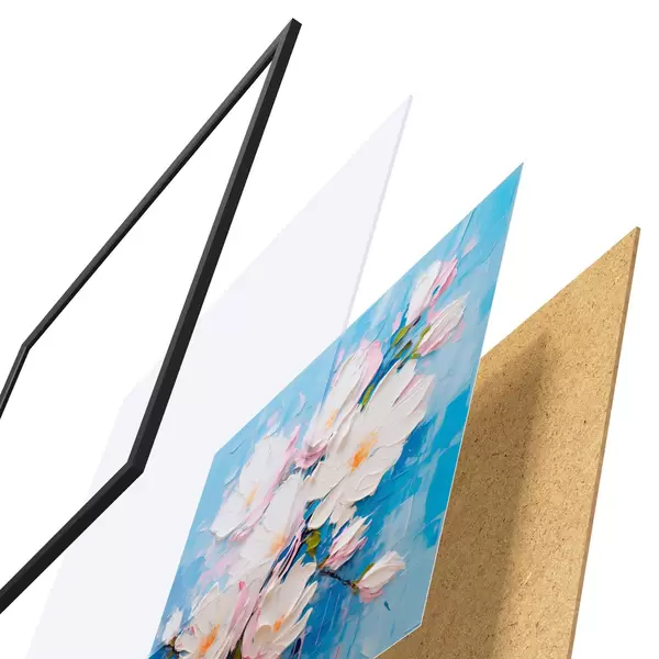A poszter keretből, plexiből, nyomtatott képből és forgácslap hátlapból áll. A poszter a hátoldalon található rögzítőknek köszönhetően azonnal felakasztható a falra.