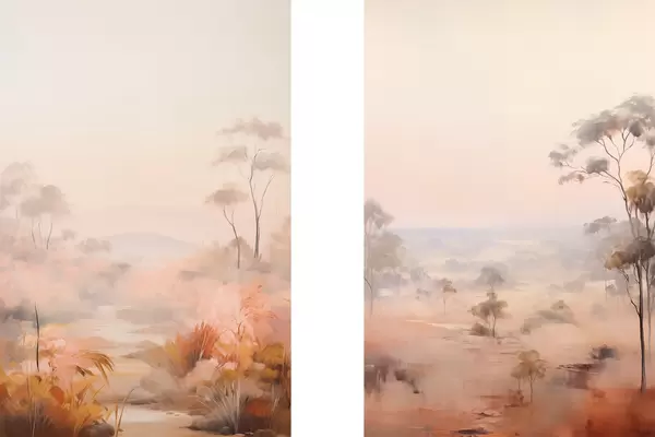 Poster Tájkép bokrokkal és fákkal rózsaszín, narancssárga és barna árnyalatokban, a háttérben hegyekkel Nr d00646