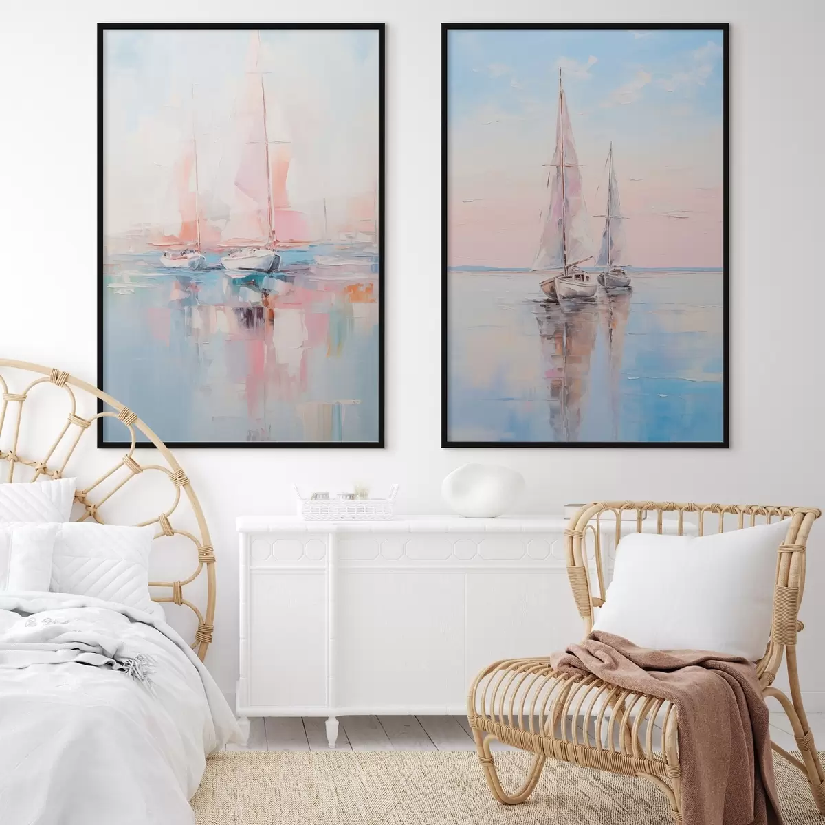 Plakát a sziklán Vitorlások rózsaszín vitorlákkal a nyugodt tengeren, a hajók tükröződése a vízben, lágy pasztellszínekben d00648
