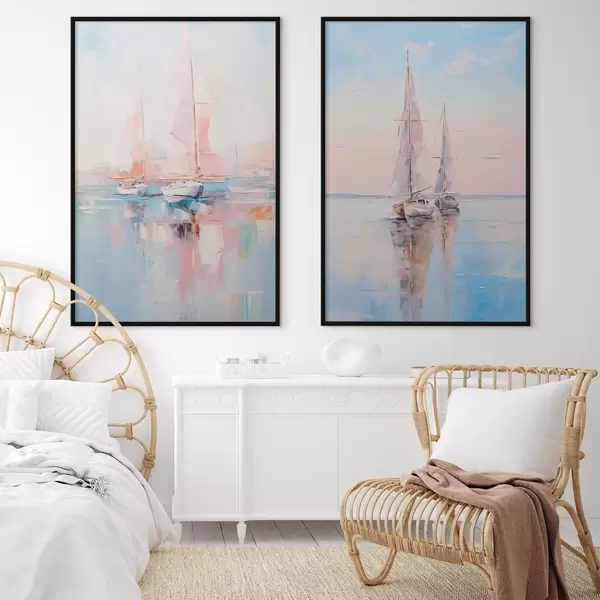 Poster Vitorlások rózsaszín vitorlákkal a nyugodt tengeren, a hajók tükröződése a vízben, lágy pasztellszínekben Nr d00648