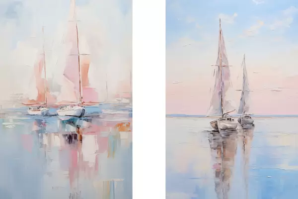 Poster Vitorlások rózsaszín vitorlákkal a nyugodt tengeren, a hajók tükröződése a vízben, lágy pasztellszínekben Nr d00648
