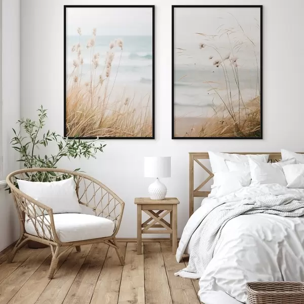 Poster Magas fű bolyhos magfejekkel, homokos tengerpart és óceáni hullámok a háttérben, lágy és tompa színpaletta Nr d00650