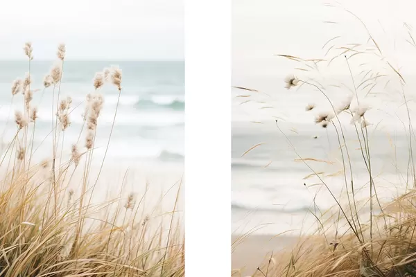 Poster Magas fű bolyhos magfejekkel, homokos tengerpart és óceáni hullámok a háttérben, lágy és tompa színpaletta Nr d00650