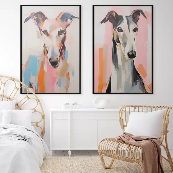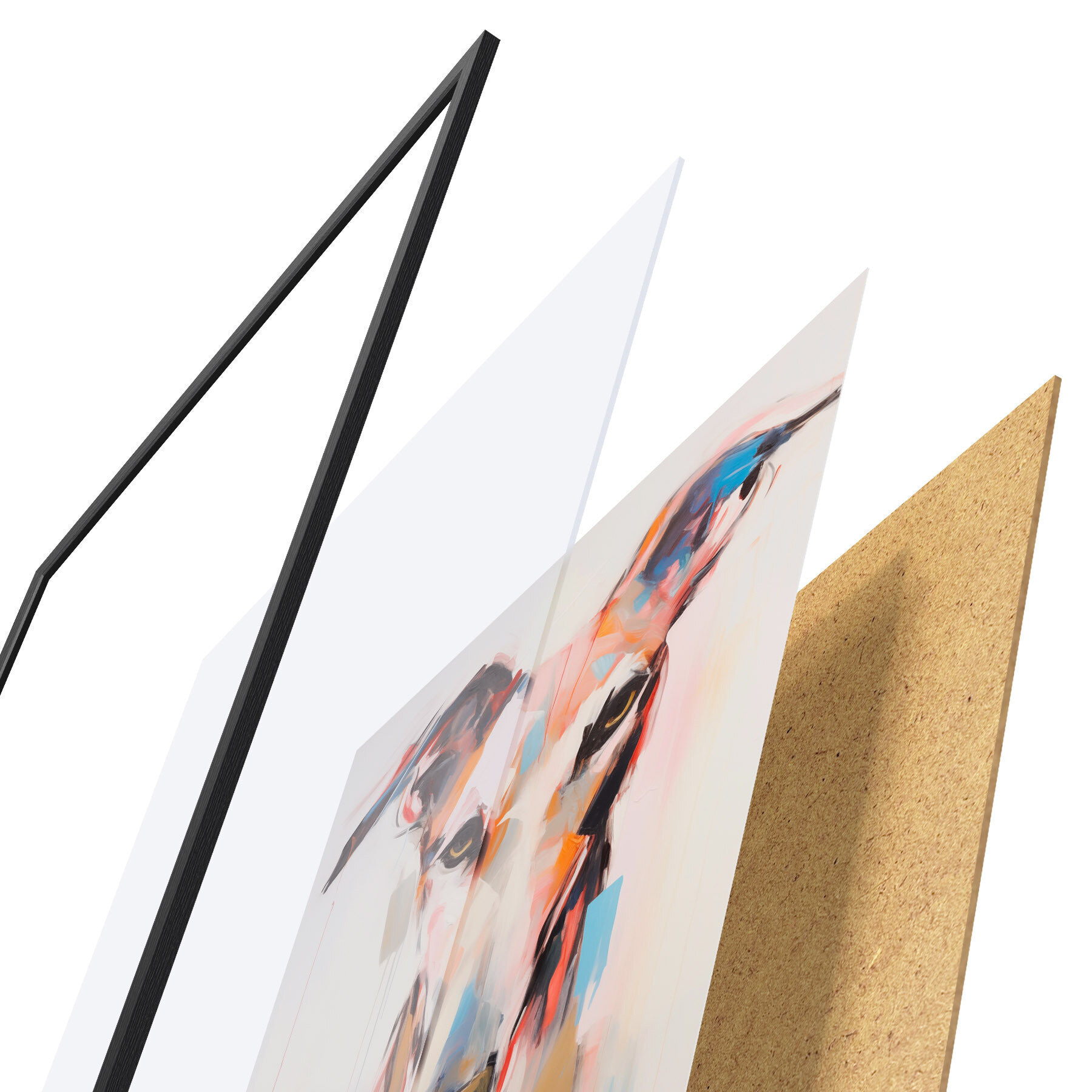 Poster Egy agár kutya, élénk színekkel, mint a narancs, rózsaszín és kék, egy egyszerű fehér háttér előtt Nr d00652