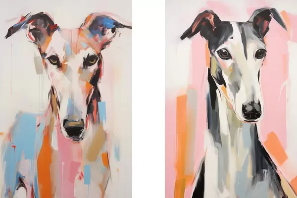 Poster Egy agár kutya, élénk színekkel, mint a narancs, rózsaszín és kék, egy egyszerű fehér háttér előtt Nr d00652
