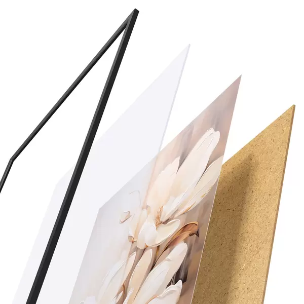 A poszter keretből, plexiből, nyomtatott képből és forgácslap hátlapból áll. A poszter a hátoldalon található rögzítőknek köszönhetően azonnal felakasztható a falra.