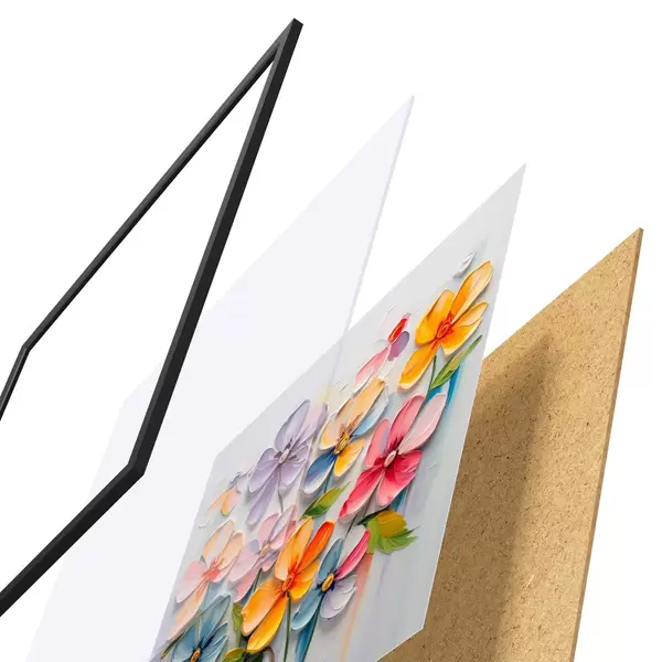 A poszter keretből, plexiből, nyomtatott képből és forgácslap hátlapból áll. A poszter a hátoldalon található rögzítőknek köszönhetően azonnal felakasztható a falra.