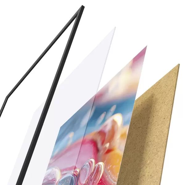A poszter keretből, plexiből, nyomtatott képből és forgácslap hátlapból áll. A poszter a hátoldalon található rögzítőknek köszönhetően azonnal felakasztható a falra.