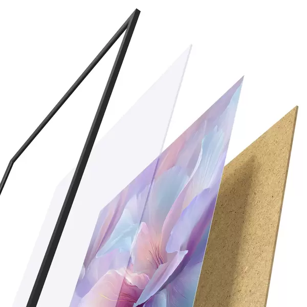 A poszter keretből, plexiből, nyomtatott képből és forgácslap hátlapból áll. A poszter a hátoldalon található rögzítőknek köszönhetően azonnal felakasztható a falra.