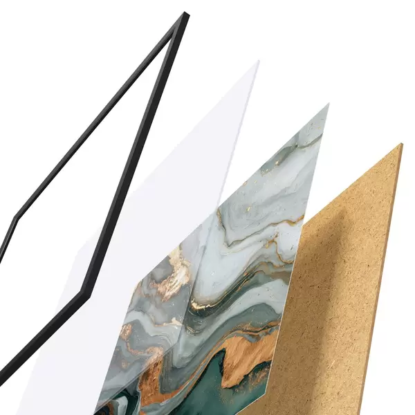 A poszter keretből, plexiből, nyomtatott képből és forgácslap hátlapból áll. A poszter a hátoldalon található rögzítőknek köszönhetően azonnal felakasztható a falra.