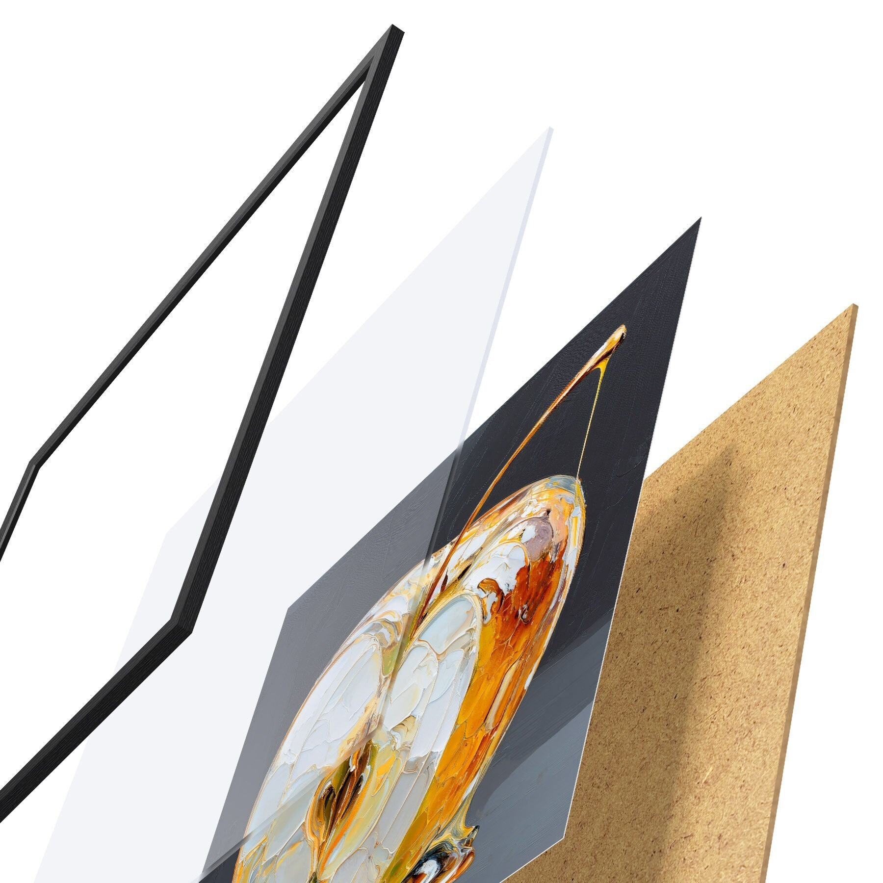 A poszter keretből, plexiből, nyomtatott képből és forgácslap hátlapból áll. A poszter a hátoldalon található rögzítőknek köszönhetően azonnal felakasztható a falra.