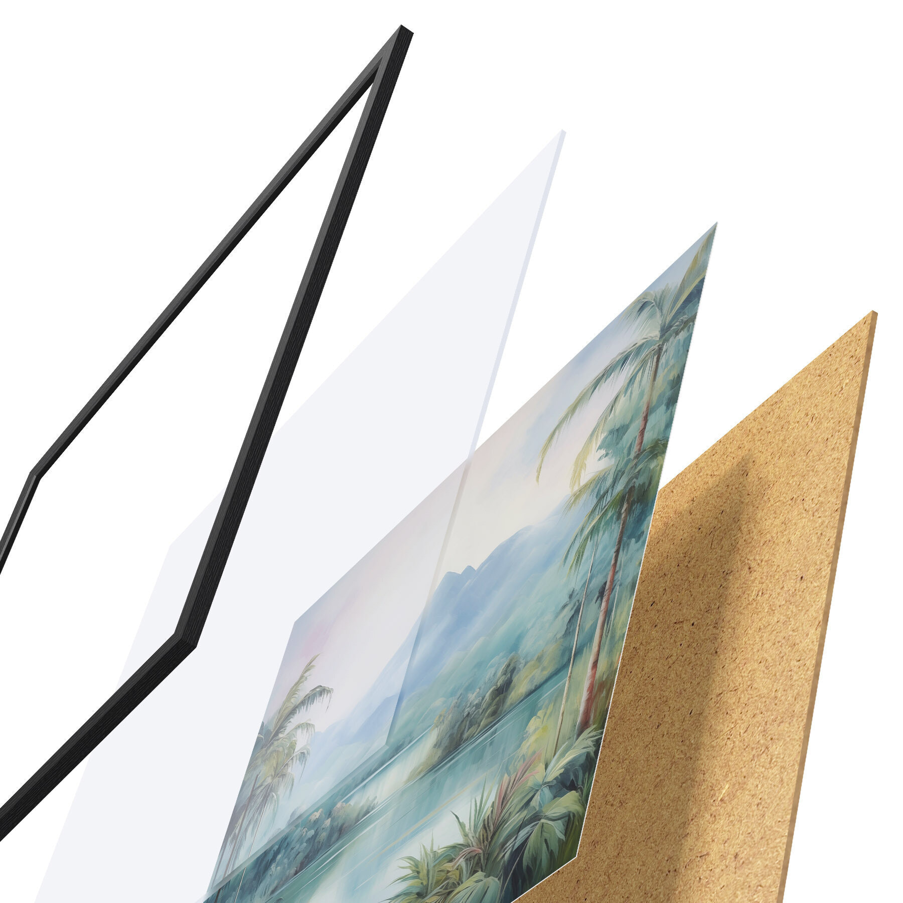 A poszter keretből, plexiből, nyomtatott képből és forgácslap hátlapból áll. A poszter a hátoldalon található rögzítőknek köszönhetően azonnal felakasztható a falra.