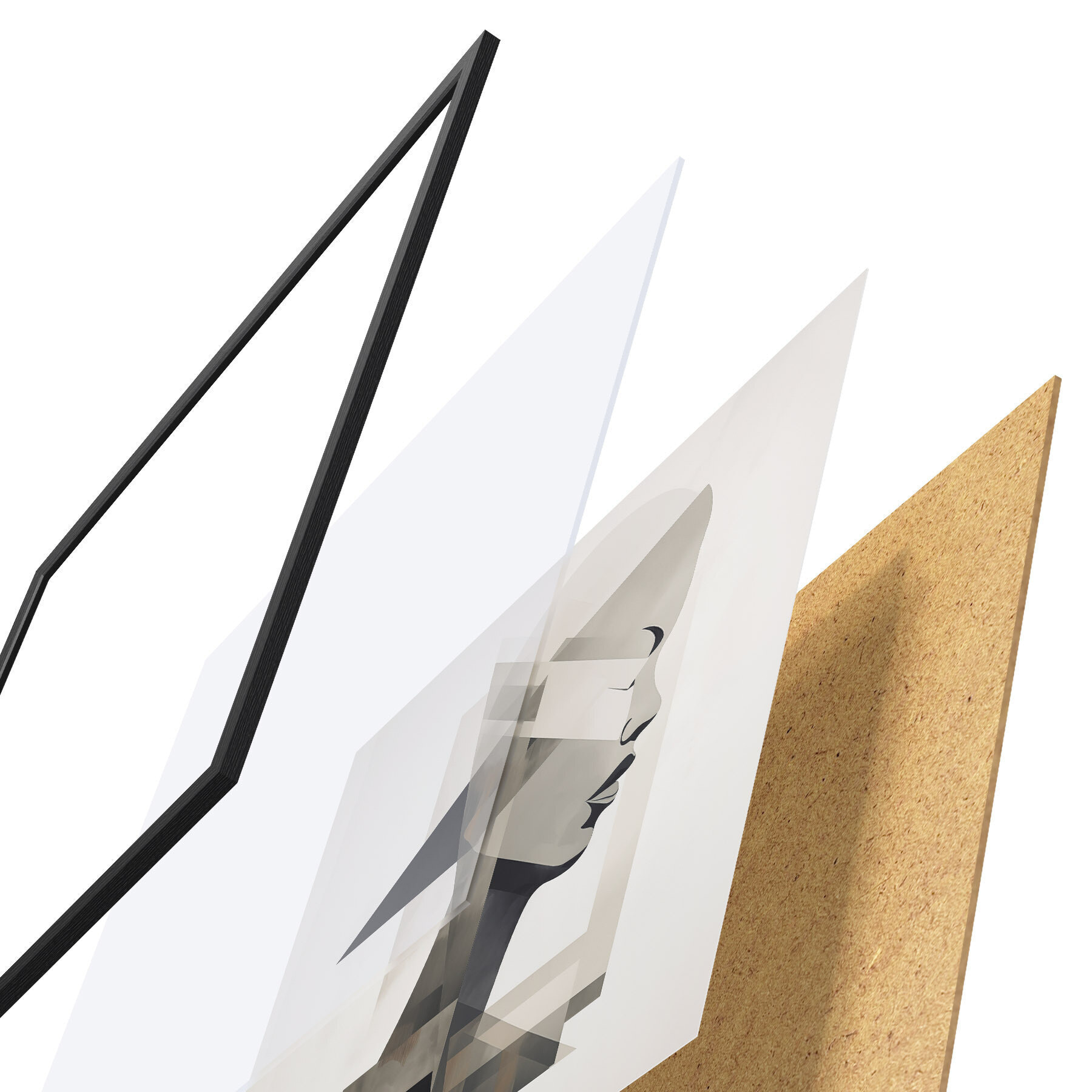 A poszter keretből, plexiből, nyomtatott képből és forgácslap hátlapból áll. A poszter a hátoldalon található rögzítőknek köszönhetően azonnal felakasztható a falra.